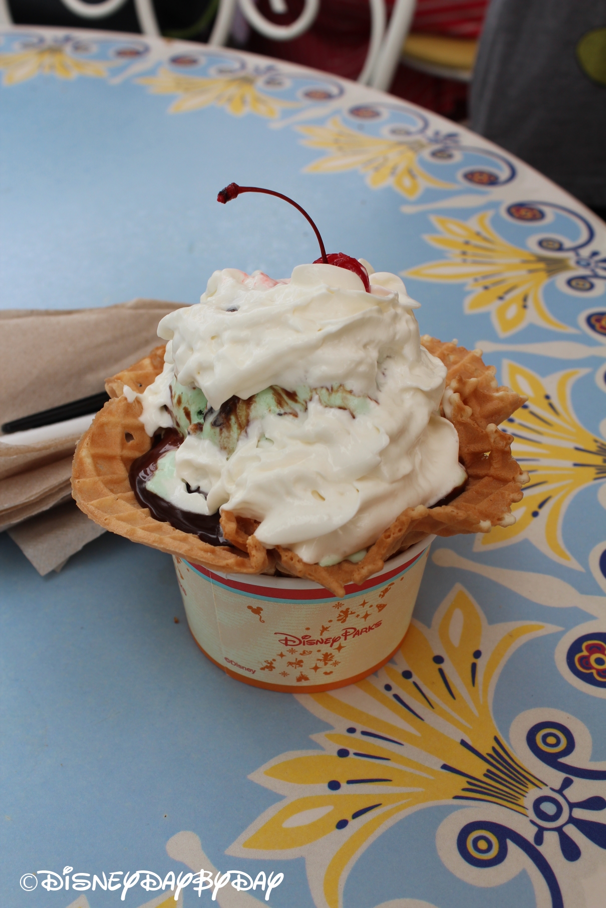 This week I continue my dessert and ice cream addiction (I promise I’ll start the 5 step program next week) with an amazing treat on Main St in Disneyland. The Firehouse Dalmatian Mint Sundae is two scoops of heaven or what some of you call mint chocolate chip ice cream (one of my favorite flavors), served in a waffle cup with hot fudge, whipped cream, and topped with a cherry. I know what you are thinking, where does the Firehouse and Dalmatian come into this special treat??? Well let me tell you, I have no idea, not a clue. First off this is ice cream so there is no heat involved, and the firehouse is at the other end of Main St and there wasn’t a dalmatian in sight. But you know what, that didn’t stop me from enjoying this ice cream wonderland and I hope, like me, you can get past the name.